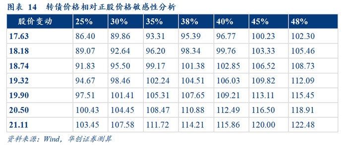 根据2021年12月22日兴业银行收盘价测算转债平价为75.74元,参考目前股份和城商行转债的浦发转债(转股溢价率71.06%)、中信转债(转股溢价率61.28%)、光大转债(转股溢价率21.22%)、南银转债(转股溢价率33.04%),预计兴业转债上市首日转股溢价率预计在38%-40%左右,对于12月22日平价,兴业转债上市价格预计在104.51元至106.03元。根据正股价格和转股溢价率进行敏感性测算,结果如下图所示。兴业转债规模和评级均符合底仓要求,债底保护较好。兴业银行当前估值较低,公司以“绿色银行、财富银行、投资银行”三张名片为重点突破,持续调整优化业务布局,商行+投行驱动,绿色业务全面发力。预计一级市场申购风险不高,上市后可关注。