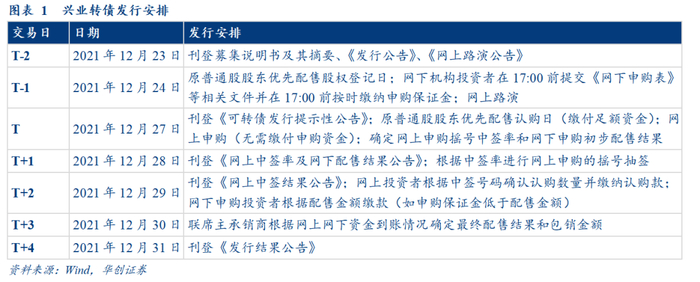 兴业转债本次发行方式上设置原股东优先配售、网下发行、网上发行三种。发行规模为500.0亿元,初始转股价为25.51元/股,目前公司总股本20,774,190,751股,本次发行摊薄比例为8.62%左右。原股东可优先配售的兴业转债数量为其在股权登记日(2021年12月24日,T-1日)收市后持有的中国结算深圳分公司登记在册的发行人股份数量按每股配售2.406元可转债的比例计算可配售可转债的数量,再按100元/张的比例转换为张数,每1张为一个申购单位。机构投资者可以其管理的产品或自有资金参与本次网下申购,每个产品或自有资金网下申购的下限均为1万手(1,000万元),上限均为500万手(500,000万元),网下申购时间为2021年12月24日(T-1 日)17:00之前。网上发行时间为2021年12月27日,网上每个账户申购数量上限是10,000张(100万元)。