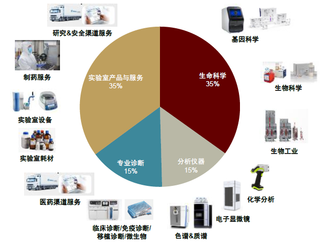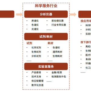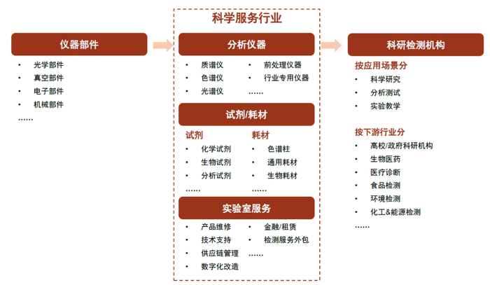 分析仪器是用于测定物质组成、结构等特性的仪器,属于广义的科学服务行业范畴。分析仪器产业链位于行业中游,上游主要为各类仪器部件,包括光学部件、真空部件、电子部件、机械部件等,下游则应用于高校、政府、第三方检测公司以及各类工业生产企业的科研、检测与教学活动中。从中游来看,分析仪器可与试剂耗材、各类实验室服务相互配套,进而为下游提供完整的科学服务综合解决方案。