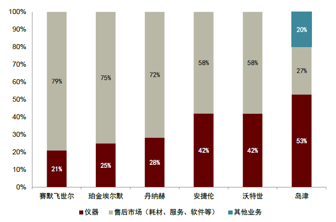 由仪器向“科学服务一体化”延申,拓宽天花板并减弱周期性。全球分析仪器龙头均较为重视庞大的客户基础带来的售后服务市场机遇,通过外延并购与内生培育,大力拓展试剂、耗材、服务业务,截至2020年,售后市场收入已占大部分龙头企业收入的50%以上。特别的,赛默飞世尔前身热电公司以分析仪器起家,而2020年仪器收入仅占其收入的21%,已形成包括分析仪器、实验室设备、试剂、耗材和软件等在内的实验室综合解决方案,甚至将业务版图向下游CRO/CDMO检测服务市场延申。我们认为,长期来看,分析仪器企业面对的“科学服务一体化”空间非常广阔,进入售后市场也有助于增加仪器企业的收入长期稳定性和可预测性。