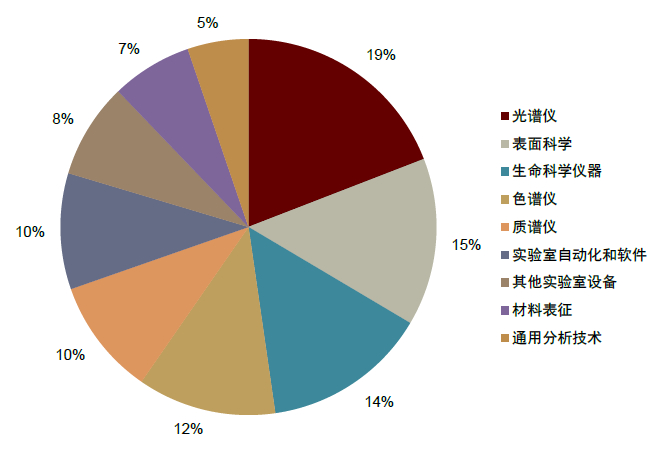 分析仪器涵盖十余个细分品类,呈现多品种、小批量特点。根据国家科技基础条件平台大型科学仪器设备分类,分析仪器可分为电子光学仪器、质谱仪器、X射线仪器、光谱仪器、色谱仪器等12个类别。而全球权威的实验分析仪器咨询公司SDI(Strategic Directions International)将行业分为10个细分领域,其中光谱仪、表面科学、生命科学仪器、色谱仪、质谱仪占比较高,2017年全球规模占比分别为19%、15%、14%、12%、10%,总体而言,仪器行业呈现多品种、小批量的行业特点。