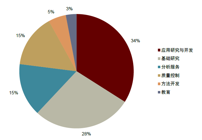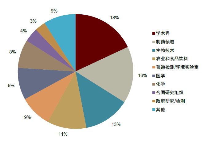 依托于研发、分析、质控等场景,分析仪器在学术/制药/食品/环境等领域得到广泛应用。根据SDI在2017年对于中国分析仪器市场的调查研究,从使用场景看,研发活动(包括应用研究与基础研究)占分析仪器应用的62%,分析服务、质量控制则各占15%;从下游行业看,分析仪器被广泛应用于学术、制药、生物、食品、环境、医学、化学等领域,占比分别为18%、16%、13%、11%、9%、9%、8%。