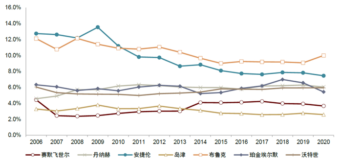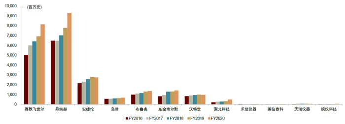 资料来源:Capital IQ,公司公告,公司官网,中金公司研究部 注:为排除2020年疫情影响,财务数据使用2019年;安捷伦、岛津为财年数据,非日历年;布鲁克为亚洲地区收入;安捷伦2011-2019CAGR数据缺失,以2013-2019CAGR作为替代