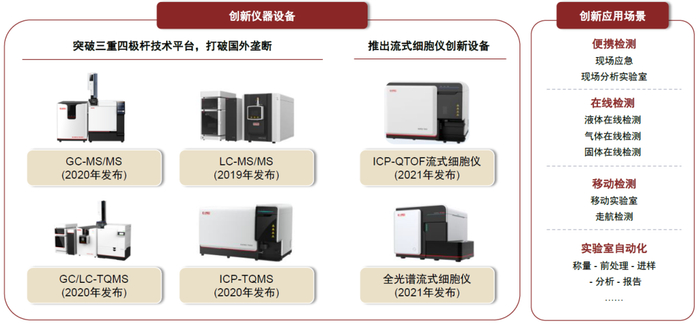 持续创新是仪器企业不可或缺的基因。分析仪器具有较高的技术壁垒,全球分析仪器龙头均保持了长周期较为稳定的研发投入,过去15年研发费用率基本处于2%~10%区间内。总结来看,我们认为海外龙头的创新基因主要体现在以下三点(以全球质谱仪龙头安捷伦为例进行说明):1)推出全球领先产品。例如安捷伦2012年推出了全球首款ICP-MS/MS,2015年推出超高灵敏度和检测范围的LC/TQMS 6470;2)引领应用场景拓展。例如拓展质谱仪在临床诊断、生物医药、细胞分析等领域的应用;3)灵活应用数字工具。安捷伦领先地推出智能化仪器及多款数字化操作管理软件,以增加仪器使用体验、提升响应速度并提高管理效率。