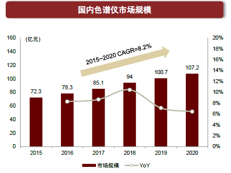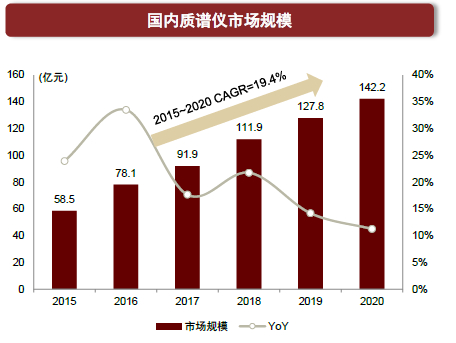 行业空间广阔,质谱仪与色谱仪为“皇冠上的明珠”。分析仪器用于测定物质组成、结构等特性,被广泛用于学术、制药、食品、环境等领域。其中,质谱仪和色谱仪分别用于物质的精确测定和分离,为量大面广、技术难度高的尖端通用仪器。从市场空间看,根据SDI数据,我们估计我国分析仪器2020年行业规模约656亿元,其中质谱仪、色谱仪约为142、107亿元,过去五年年均复合增长率约为19.4%、8.2%。