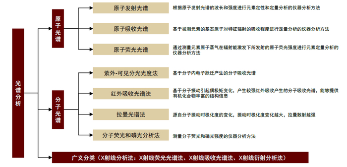 光谱仪是进行物质结构与成分分析的基础仪器。光谱仪又称分光计,其原理为,通过物质与光的相互作用,并对形成的光谱线进行分析,由于不同物质具有不同的光谱特征,进而光谱仪可探测出物质结构和物质成分。光谱仪被广泛应用于冶金、地质、石油化工、环境保护、生命科学等行业。其细分品类包括原子光谱、分子光谱、X射线光谱等。与质谱仪相比,光谱仪相对操作与流程简单,测试速度快,并且大多数无需破坏样品,价格也较为低廉,但整体上在检测的精度、可靠性、检测范围上与质谱仪存在明显差距。