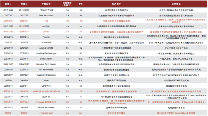 特别的,龙头在并购中也非常注重协同效应。以赛默飞世尔在分析仪器领域的并购活动为例,赛默飞世尔注重与标的产生协同效应,一方面吸收利基市场的优质企业,获取独特技术,与原有产品组合形成更完善的解决方案;另一方面则进行多次大型并购,快速拓展新领域或新市场。例如,2016年赛默飞世尔收购FEI进入电显市场,收购前的2013-2016年FEI收入CAGR仅约1.6%,收购后赛默飞世尔着力拓展电镜在生命科学领域与中国市场的应用,并优化了仪器的生产模式,增强产品竞争力,进而使该业务实现了5%~10%的持续增速。