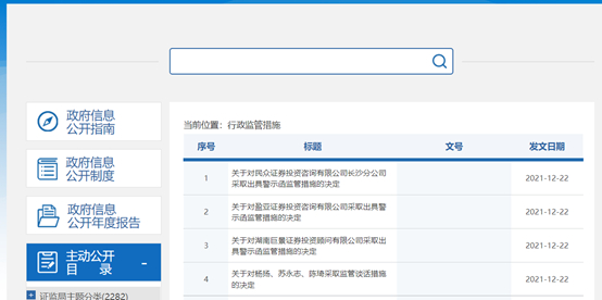 12月22日,湖南证监局分别对民众证券投资咨询有限公司长沙分公司(简称“民众投顾”)、盈亚证券投资咨询有限公司(简称“盈亚证券咨询”)、湖南巨景证券投资顾问有限公司(简称“巨景投顾”)采取出具警示函监管措施,另也对湖南金证投资咨询顾问有限公司(以下简称“金证咨询”)三名负责人采取监管谈话措施。