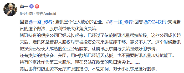 也有网友觉得,腾讯此举防止了资本无序扩张的推动,不管如何,对于小股东是挺好的事。