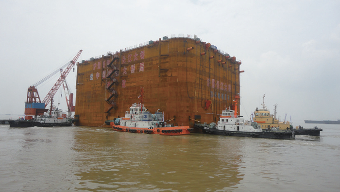 沉井的制造及运输采用“船坞内整体制造、整体出坞浮运”的方法。钢沉井在工厂内分节加工制造,在厂内船坞内(长580 m,宽190 m,深13.5 m)完成沉井整体拼装。钢沉井采取助浮措施浮运出坞(见图2),利用拖轮浮运到桥位进行定位。底节沉井着床稳定后现场分步接高混凝土节段(见图3)。
