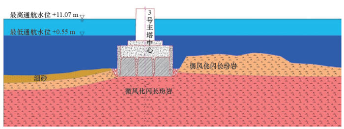 海洋桥梁设置基础具有体积重量大、基础面积大、承载力高、刚度大、抗船撞、抗震能力强的优点,特别适用于地质条件复杂的深水环境。芜湖公铁二桥3 号主塔为设置钢沉井的圆端形结构(见图1),基底尺寸为65 m × 35 m,钢沉井高19.5 m。底节钢沉井采用气囊法下河,利用拖轮浮运到墩位。系泊锚碇对底节沉井初步定位,再接高沉井和围堰并注水下沉至设计高程。沉井外侧壁与爆破开挖的基坑壁之间抛填碎石进行堵漏。爆破时采用斜向梅花形布孔的微差起爆技术,以达到块度均匀的效果,前期使用贝型抓斗清渣效率很低,后改用2 台重型多瓣式抓斗同时作业,提高了出碴效率。