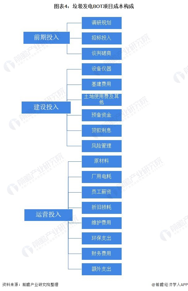 BOT模式下,垃圾发电行业成本和收入的利益相关者主要是建设商/运营商。且垃圾发电BOT项目成本主要从项目的前期投入、建设投入、运营投入三个阶段来划分。前期投入主要包括调研规划、招投标及谈判磋商投入。建设投入主要包含设备仪器、基建费用、土地使用费、贷款利息等。运营投入成本主要有原材料、用电耗、员工薪资、折旧、维护、环保支出等。
