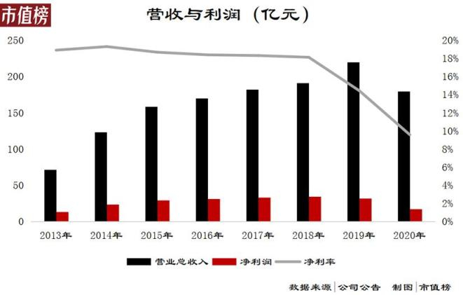 更为突出的问题是利润,2015年至2018年,海澜之家净利率陷入了滴漏似下滑,分别是18.7%、18.4%、18.3%和18.1%,2019年和2020年直接跳水至14.4%和9.6%。典型的增收不增利。