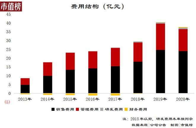 结果就是费用激增,2020年相较2014年,销售费用增加142.5%,管理费用增加60.2%。销售费用增长率和管理费用增长率始终大于营收增长率,最终导致净利率的下降。