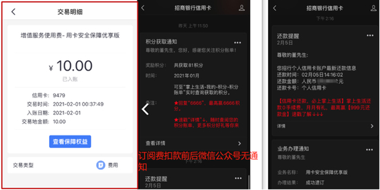 不仅如此,董先生还发现,招行信用卡在扣取10元的月费后,没有在微信端推送扣款通知(通常主要用户微信绑定银行卡,在消费时都会收到消费金额通知)。也就是说,如果招行信用卡持卡人不自己查询账单明细,根本就无法发现这笔“隐秘”收费。