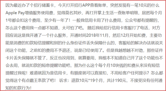 另一名招行信用卡用户A投诉称,他查信用卡账单发现,招行每月1号会收取一笔10元的增值服务使用费。询问客服后得知,这个服务2018年11月就开通了,12月开始扣费,收取了19个月!客服给的解决方案是关闭功能,之前费用不退还。