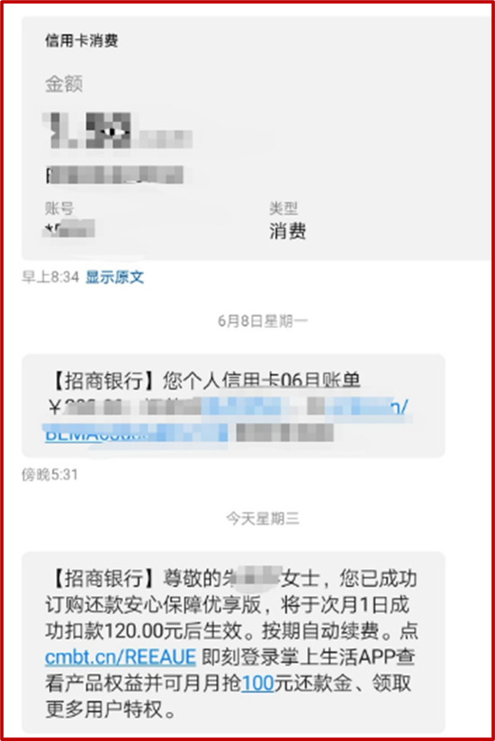 例如,用户B投诉称,他接到招行客户推销电话,听完后没听懂就挂掉了。没想到,不久就收到短信,招行帮他订购了“还款安心保障”增值服务,1号开始扣费120元,到期自动续费。
