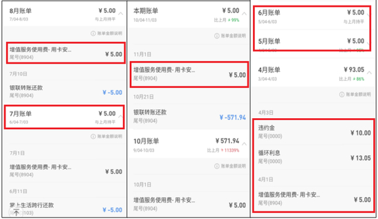还有一名用户更加倒霉,他发现自己的信用卡被自动扣费长达4年,而且有一个月还因为5元钱“增值服务费”逾期未还,被招行收取了逾期违约金和循环利息!