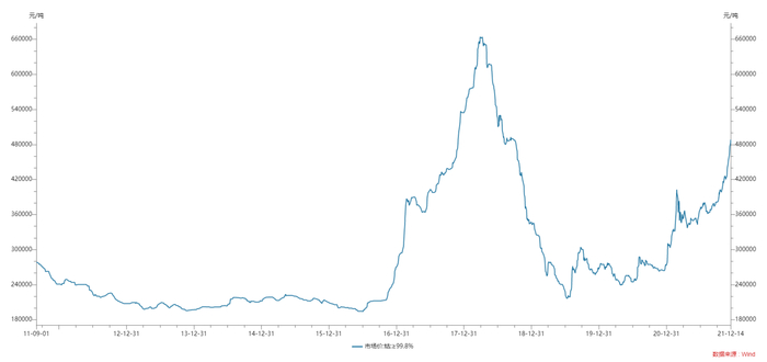 Wind数据显示,截至12月14日,电解钴(>99.8%)的价格达到48.83万元/吨,同比上涨84.85%;硫酸钴、四氧化三钴等钴盐价格也均同比上涨约80%。