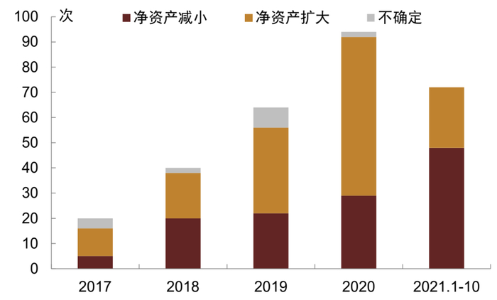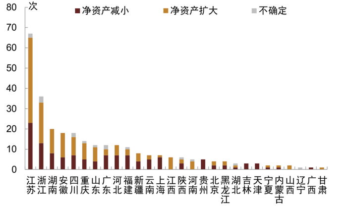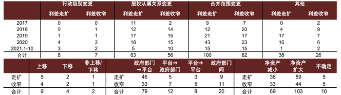 就合并范围变更类评级调整行动而言,2017年至2021年1-10月净资产扩大的情况合计150次,占合并范围变更类总次数的51.7%,同期净资产减小、不确定的情况分别占比42.8%、5.5%;分年份看2017年来净资产减小的次数逐年上升,其中2021年1-10月达48次,远超2020年全年,可能意味着将现有平台中部分资产归集到主要平台的趋势加强,与此对应的是2017-2020年净资产扩大的次数同样逐年上升,其中2020年达到63次的近年高峰,但2021年1-10月次数同比下降,可能与整合后主要平台数量较少有关。分省份看,合并范围变更类评级调整行动分布全部28个存在转型相关评级调整的省级行政区,发行量较大的江浙等区域涉及评级行动次数相应较多,以净资产扩大或是净资产减小的情况为主,并且在不同区域间差异较大,例如基本或全部为净资产减小的情况既可能发生在上海这样的低利差区域,也可能发生在贵州、吉林、天津等高利差区域,而中间利差的江西城投全部为净资产扩大。