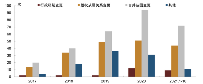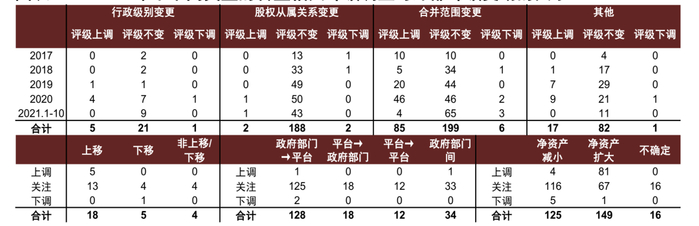 分年份看,2017-2020年转型相关评级调整行动合计分别为40、94、151、188次,逐年上升(2021年1-10月四类评级调整行动合计也达136次,简单年化后全年次数合计低于2020年,但高于2019年);2017-2020年末城投债存续金额分别为7.27、7.85、9.13、11.07万亿元,从有关城投转型的评级调整行动次数占城投债存量的比例简单匡算,近年来城投平台的转型动作渐趋频繁,评级公司对其的关注程度也随之上升。分类型来看,行政级别变更、股权从属关系变更、合并范围变更三大类评级调整行动的次数近年来均有所上升,其中合并范围变更类占转型相关评级调整行动次数合计的比例基本维持在40-50%,而行政级别变更类则相对较少,2017-2019年每年只有2次,但2020年明显上升至12次。