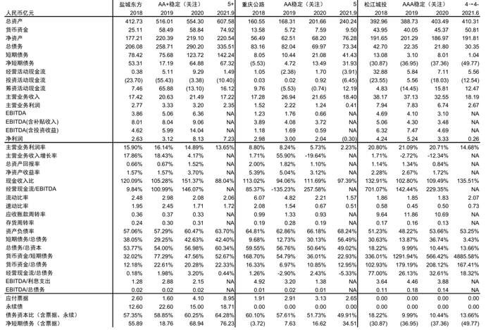 图表15:盐城东方、重庆公路、松江城投的重要经营和财务信息、外部评级和中金评级