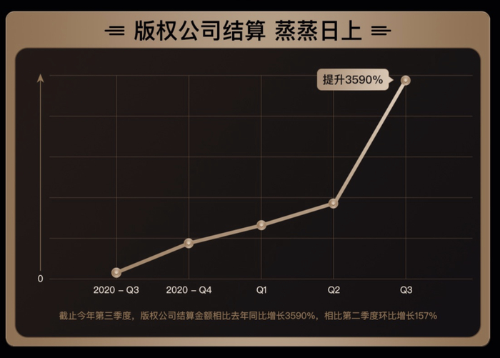 大半年过去,快手已与上百家版权公司达成合作, 官方公布的数据显示,截止第三季度,版权公司的结算金额相比去年同比增长3590%,相比第二季度环比增长157%。与之对应,版权公司的歌曲使用量也呈现出稳步增长趋势。对比4月,歌曲使用量整体提升119%。