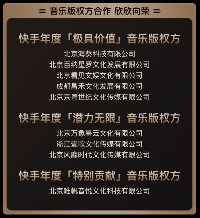 而近日,快手音乐又玩起了年末“撒钱”,在推出榜单的同时,也向今年合作过的所有版权方发了一笔“千万年终奖”。用年度大奖和阳光普照的方式对所有合作方雨露均沾。活动起名“众乐”,言下之意也很明显,在当下的版权生态里,多家平台就多份利润,与君众乐乐,这也是快手表达诚意的方式。