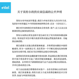 美媒注意到,英特尔在声明中强调,对供应商的要求是“为确保符合美国法律要求”,没有其他意图,也无意表达立场。