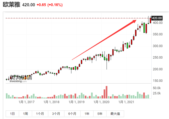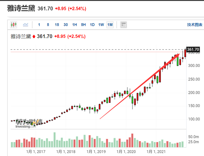 而竞争对手欧莱雅(L ‘Oreal, OR.法国)和雅诗兰黛(Estee Lauder, EL)的股价同期分别上涨了120%和188%。