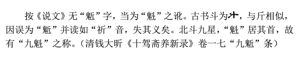 大家就是大家。钱大昕这一考证,看似仅仅是一个字的字形字义,对我们了解古人的天文观念,却十分重要。由于“魁”字在天文学上本为“斗魁”之义,也就是北斗的第一至四星,故刘向、王逸辈所谓“九魁”,实际上是用“魁”来代指北斗,“九魁”也就相当于“北斗九星”。这样一来,所谓“北斗九星”,也就真成了古人一种确切的说法了。