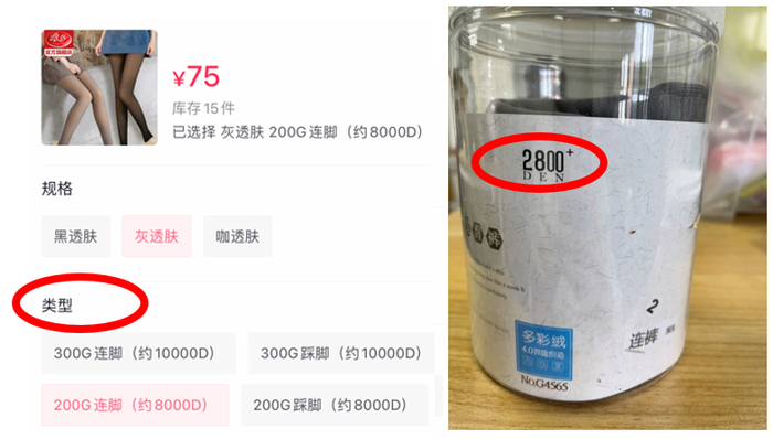我们以同样不加绒的两件样品为例,标称由大创(上海)商业有限公司经销的保暖袜,其实测线密度为82.7D,保温率18%,而标称由杭州网易严选贸易有限公司生产经销的连裤袜,其实测线密度为31.3D,保温率30%。这表示,前者的旦数虽高,但保温率却远低于后者。