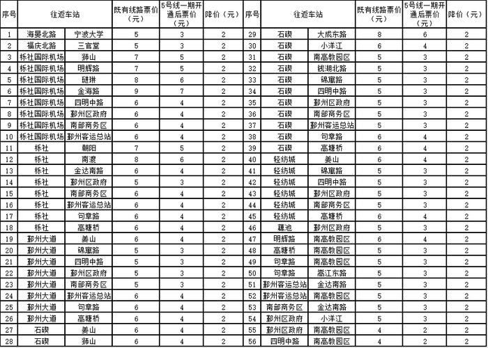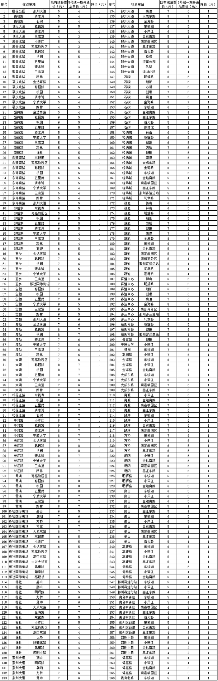 随着5号线一期的开通,宁波轨道交通线网的换乘站点也将增加,如海晏北路站是1号线与5号线的换乘站,石碶站、三官堂站是2号线与5号线的换乘站,鄞州区政府站是3号线与5号线的换乘站,南高教园区站是4号线与5号线的换乘站。根据进出站间最短路径计算法(无论在哪一站换乘,票价均按最短路径计算法计算),部分既有线路车站间票价将会下降,经统计,既有线路共266对站间票价将下降1元、56对站间票价下降2元,市民坐地铁更便宜喽!