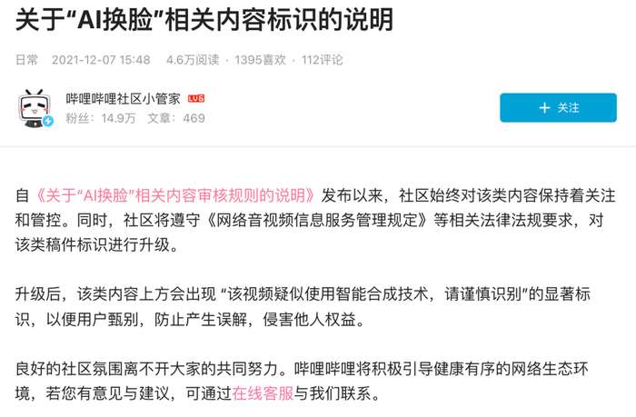 据了解,针对AI换脸带来的风险和争议,B站于2019年宣布AI换脸内容将不予推荐,同时禁止排行榜和热门位置的展示。近日,B站对AI 换脸类稿件标识进行了升级。据悉,升级后该类内容上方会出现“该视频疑似使用智能合成技术,请谨慎识别”的显著标识,以便用户甄别,防止产生误解,侵害他人权益。