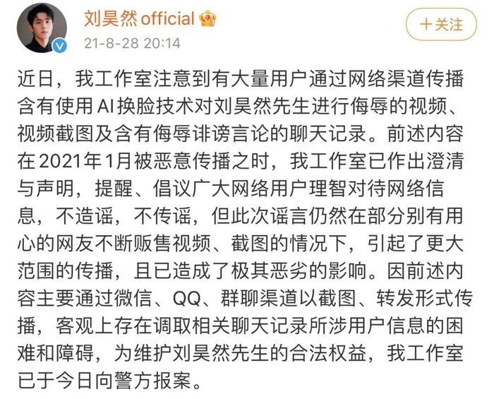 更多的是,还有一些人利用AI换脸技术造谣,尤其是用在公众人物身上。今年8月,演员刘昊然的工作室报警,称网友利用AI换脸技术传播对刘昊然带有侮辱性的视频、截图,同时还有含有存在诽谤言论的聊天记录。