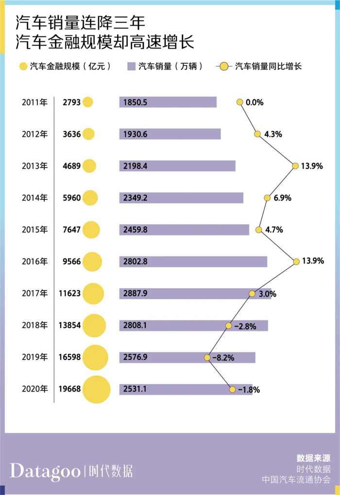 大部分人的答案是愿意。从数据上看,国内汽车销量连降三年,而汽车金融市场规模却仍保持高速增长。2020年汽车金融市场规模接近2万亿,与2017年相比规模增长70%。
