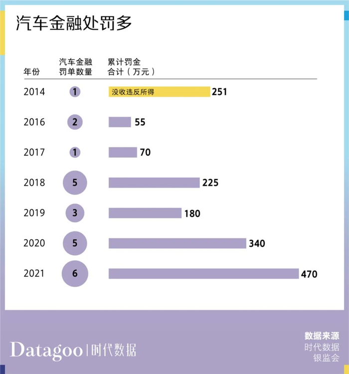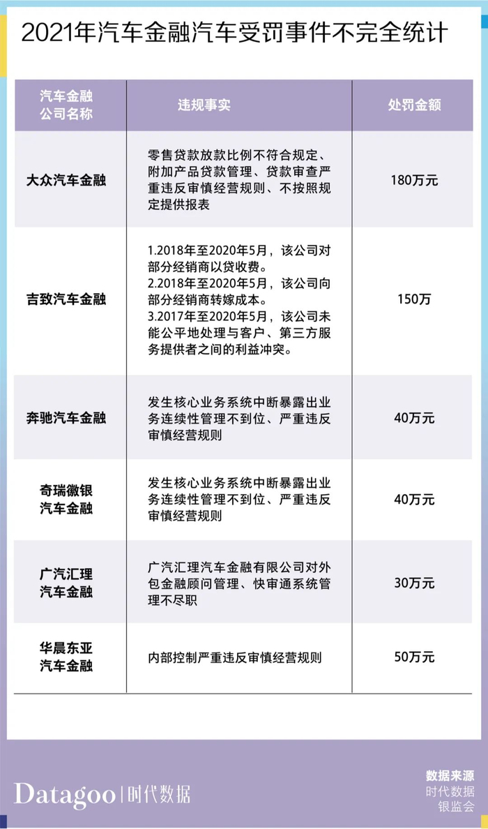 据不完全统计,今年以来,共有6家汽车金融公司接到罚单,累计罚金合计达470万元,远超去年全年的罚单金额。单笔罚金超过100万元的有两家,分别是大众汽车金融和吉致汽车金融有限公司(以下简称“吉致汽车金融”),其余公司的处罚金额在20万元至50万元不等。