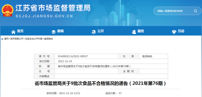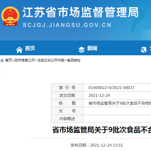 江苏省市场监管局关于9批次食品不合格情况的通告(2021年第76期)