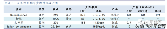 天齐锂业是锂龙头企业,是全球极少数同时布局优质锂矿山和盐湖卤水矿两种原 材料资源的企业之一,产业链覆盖上游矿山/盐湖、中游锂盐生产,还布局下游锂电企 业。在矿山资源板块,现拥有 134 万吨/年产能——以西澳大利亚 Greenbushes 矿为资 源基地,四川雅江措拉锂矿为资源储备,获得了稳定、低成本、优质的锂原料供应。