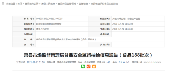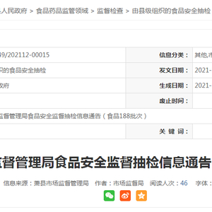 安徽省萧县市场监管局抽检188批次食品 合格样品188批次
