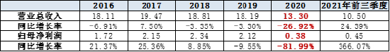 2021年前三季度,瑞贝卡共实现营业总收入10.50亿元,同比增长24.39%;实现归母净利润0.45亿元,同比增长366.07%。然而,说扭转业绩退市还太早,通过查看瑞贝卡近5年的营收及净利润我们发现,2021年前三季度的高增长实则是因为2020年的低基数。