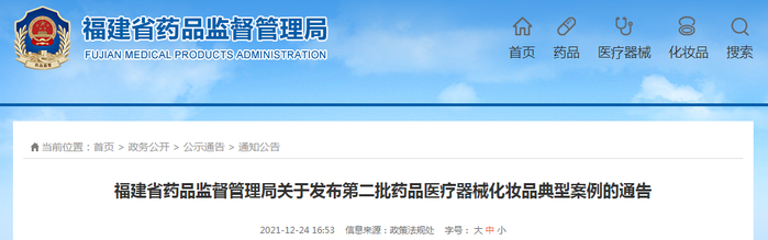 福建省药监局关于发布第二批药品医疗器械化妆品典型案例的通告
