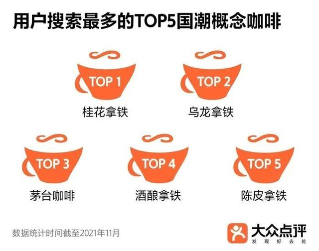 对比2019年,2021年国潮概念咖啡关键词的搜索量达279031次,上涨近10倍,评价量上涨2.3倍。桂花拿铁、乌龙拿铁、茅台咖啡、酒酿拿铁、陈皮拿铁成为上海消费者搜索最多的五个国潮咖啡口味。其中,桂花拿铁一年搜索次数达61040次,比2019年增长近7倍。