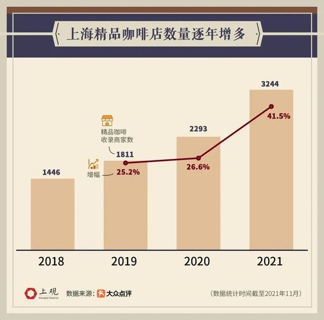 《报告》显示,截至2021年11月,上海的精品咖啡店的数量位列全国第一,达到3244家,占咖啡店总量(7200家)的45.1%;并且增速较快,三年涨幅达124%,2021年新开951家门店,同比增长41.5%。