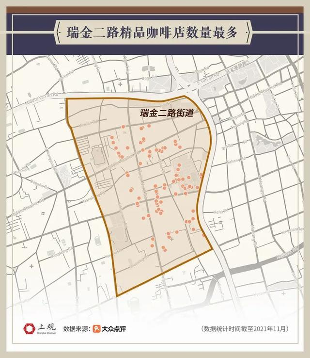 我们再将视线聚焦,如果以街道为观察对象,位于衡复风貌区黄浦片区东部的瑞金二路街道,成为今年的“黑马”,从2020年的51家(排名第四)增至今年的83家,平均每20米便有一家精品咖啡店。