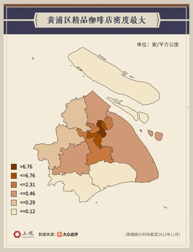 黄浦区每平方公里约有13.6家精品咖啡店;其次是静安区与徐汇区,每平方公里分别有7.4家与6.7家精品咖啡店。
