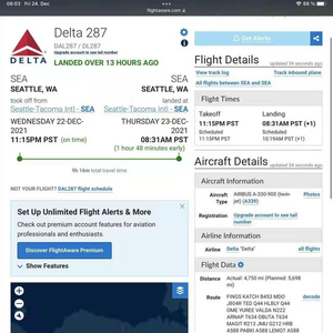 红星新闻记者在国外实时跟踪航班信息的网站(FlightAware)上看到,确实显示12月22日从西雅图起飞的航班DL287经俄罗斯边境上空后折返,于23日早上8:31重新降落于西雅图。
