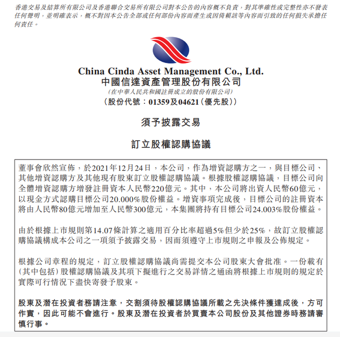 12月24日,中国信达资产管理股份有限公司(1359.HK)发布公告称,该公司作为增资认购方之一,与重庆蚂蚁消费金融有限公司(以下称蚂蚁消金)、其他增资认购方及其他现有股东订立股权认购协议。