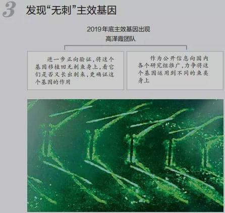 第三步是发现“无刺”主效基因。这一步需要进行正向验证,将这个基因移植到无刺鱼身上,看它们的鱼刺是否还能长回来。同时作为公开信息向国内各个研究组推广,力争将这个基因运用到不同的鱼类身上。