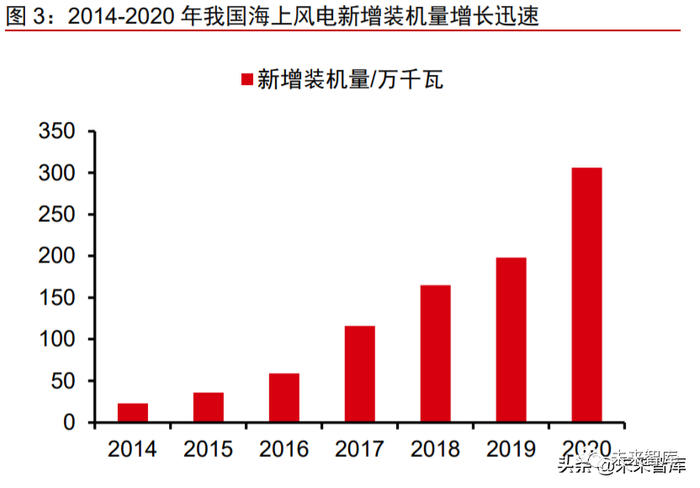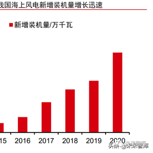 国内海上风电在政策支持下快速发展,产业链逐步成熟。据 GWEC 数据,中国在 2020 年实现了 3 GW 以上的海上风电新增并网,连续第三年成为全球最大的海上风电市 场。2020 年全球新增海上风电中国占比最高,达到 50.4%,全球海上风电总装机量为 35.3GW,中国占比为 28.3%。